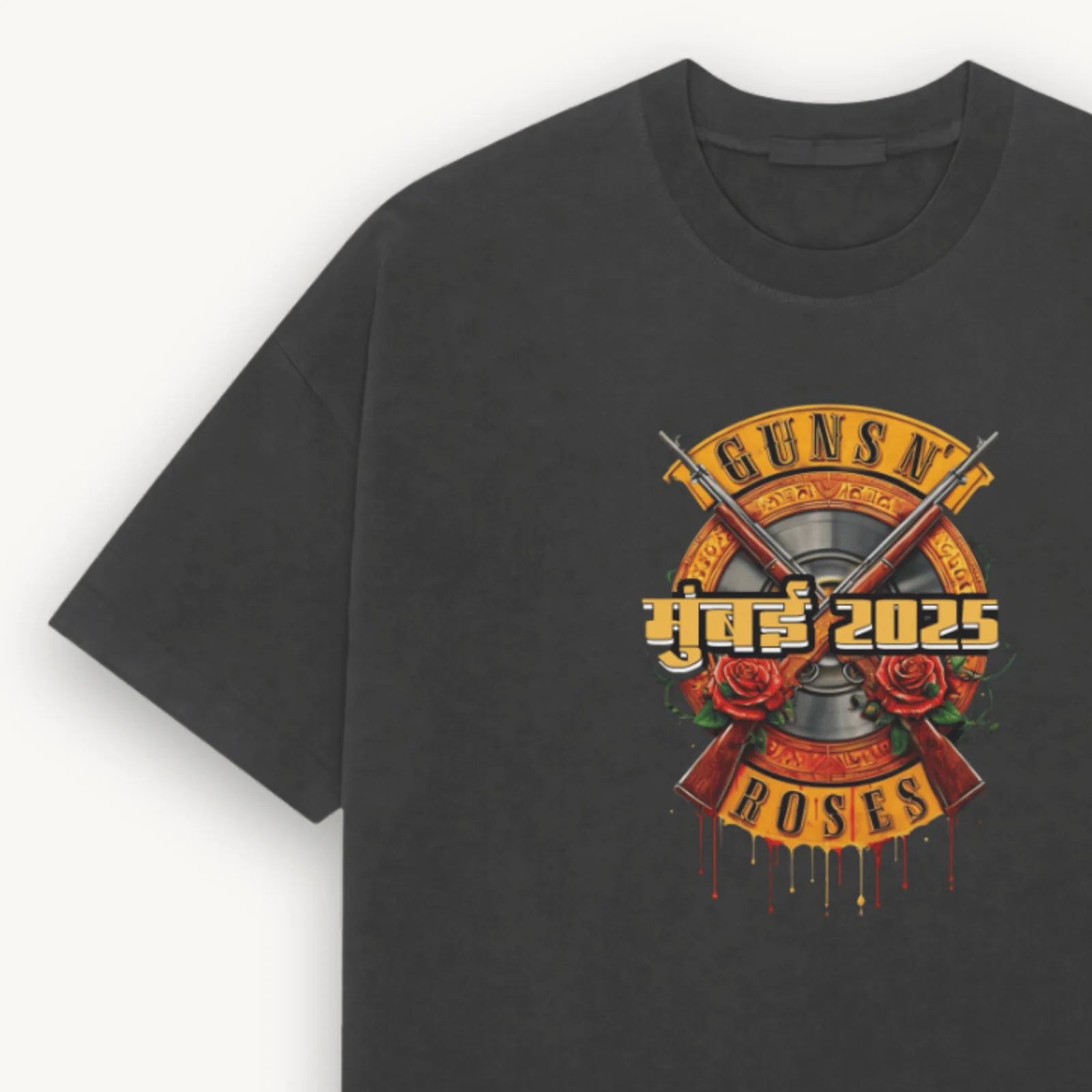 This limited-edition tee is part of the official Guns N’ Roses drop, created exclusively for their 17th May Mumbai tour stop — and approved by the band themselves. Made with heavyweight 210 GSM 100% cotton, it blends comfort and edge with an relaxed silhouette built for loud nights and bold fits.